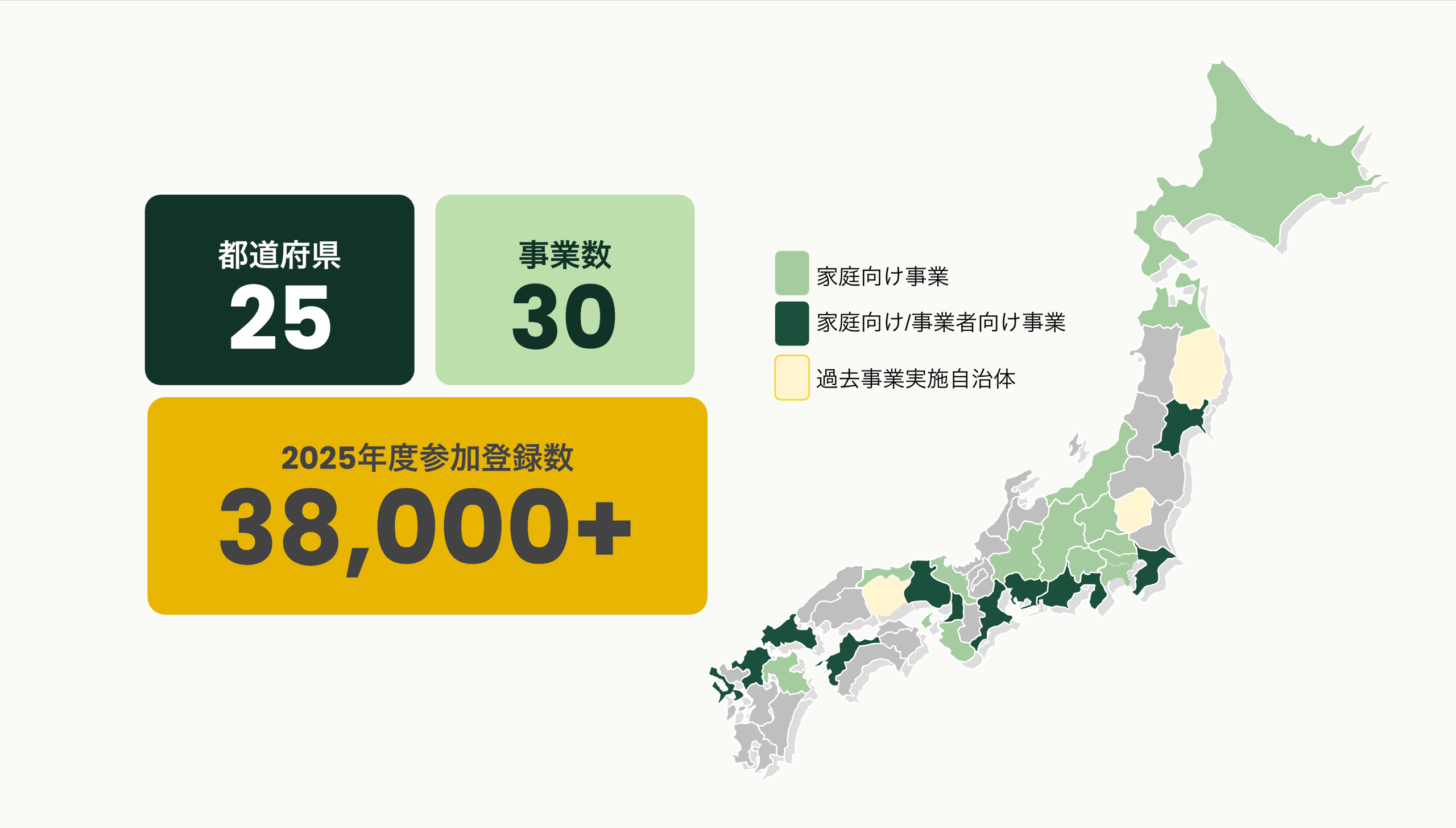 日本国内では2019年に事業を開始し、現在は50を超える自治体と協定を締結し、家庭及び事業所向けに、太陽光パネルおよび蓄電池の共同購入事業を実施しています。